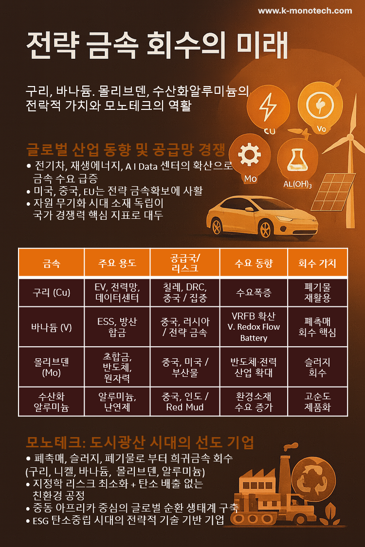 구축을 통해 ESG 및 탄소중립 트렌드에 부합하며, 글로벌 공급망 재편 속에서 전략적 파트너로 부상하고 있습니다. 이에 따라 모노테크의 폐자원 기반 금속 회수 사업은 높은 성장성과 투자 매력을 갖춘 산업으로 주목받고 있습니다.